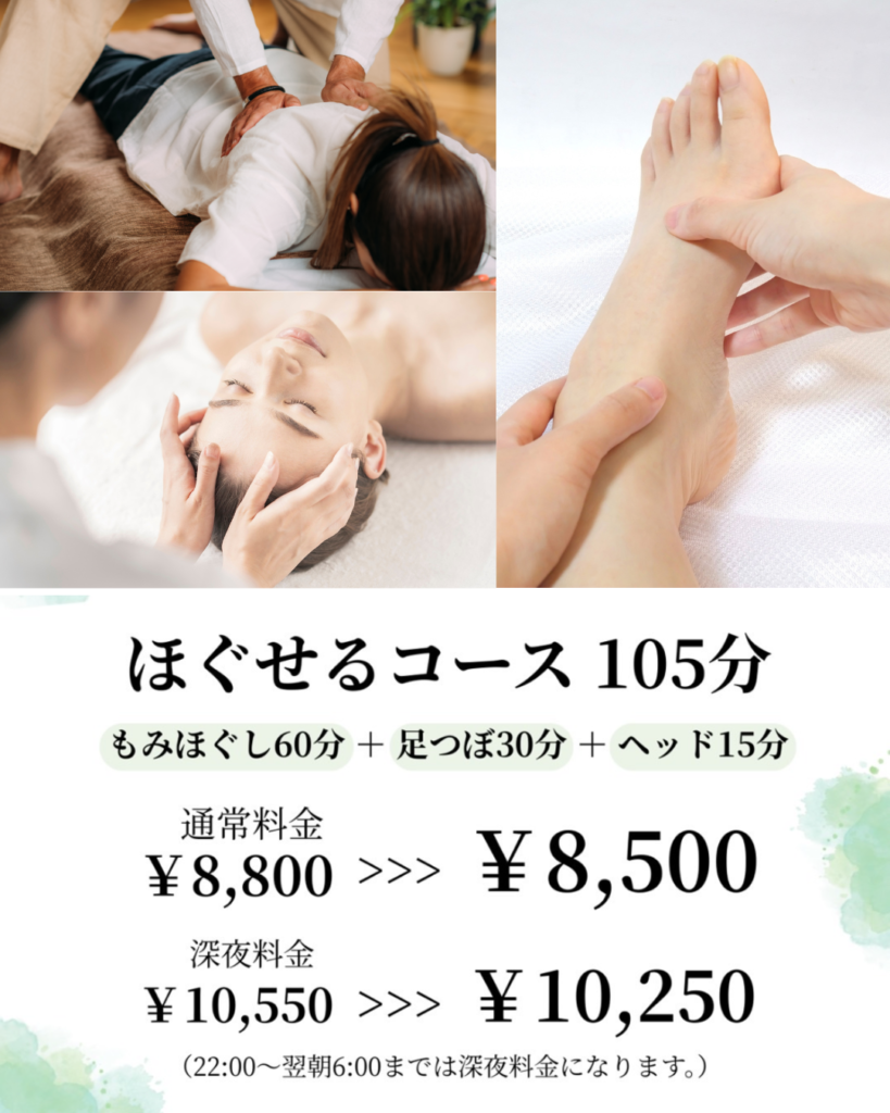 当店おすすめの「ほぐせるコース105分」は、もみほぐし60分・足ツボ30分・ヘッド15分がセットになった全身ケアコースです。首や肩、背中、腰はもちろん、足裏から頭までしっかりアプローチし、全身を隅々まで整えていきます。