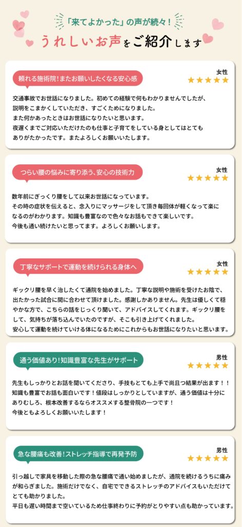 ご要望に応じて力加減やもみ方を調整できるのはもちろん、ご自身では気付かなかったコリやハリも撃退します。