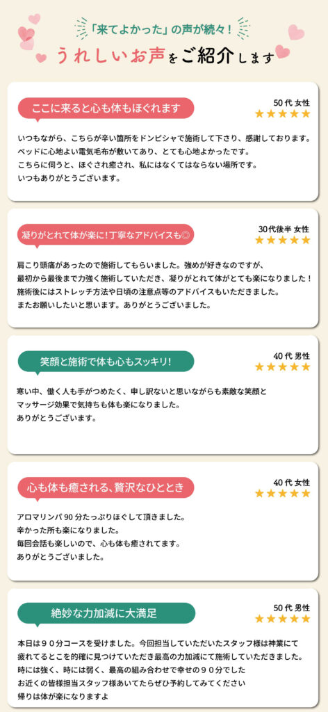 全身もみほぐしから極上のアロマリンパマッサージまで幅広いメニューをご用意し何度も気軽にご利用いただける料金設定にしました。